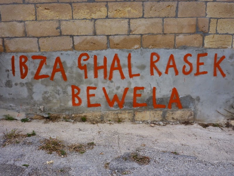These horrible swathes of graffiti have been daubed on walls and peoples property outside my village on the way to a swimming site. Theres about 10 of them, they say 'watch out for your head', and are directed at a local woman for reporting illegal shooting. Other graffiti aimed at another women, are on the approach to the best beach on the island, Ramla Bay.
